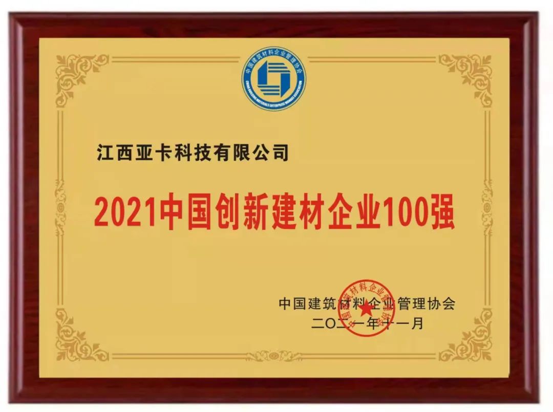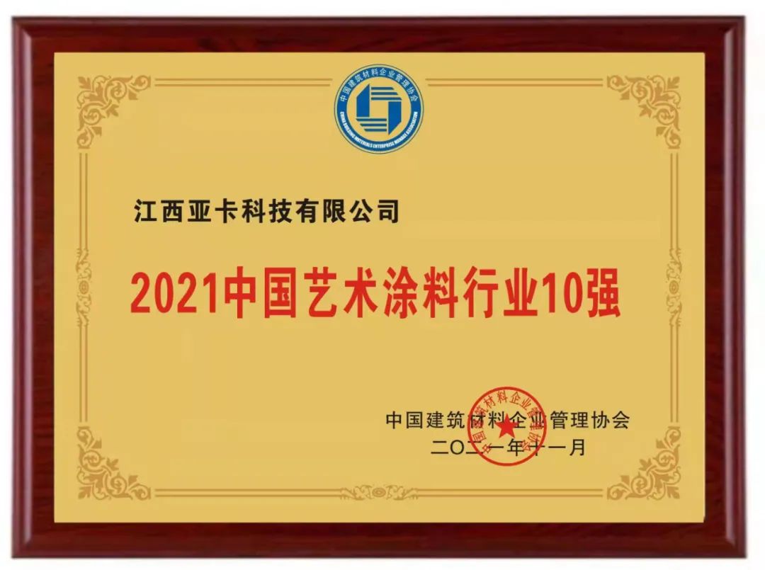 喜訊丨亞卡涂料榮獲“2021中國創(chuàng)新建材企業(yè)100 強”“中國藝術涂料行業(yè)10 強”榮譽稱號