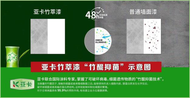 亞卡竹萃漆是采用原生竹物萃取工藝制成的,由于竹液中含有一種名為竹醌的天然抑菌物質(zhì),所以它在制成涂料之后,仍然具有抗菌、抑菌的效果。此外,竹物萃取液是嚴(yán)格執(zhí)行原生植物提取標(biāo)準(zhǔn),在制作過程中,不添加任何有害化學(xué)物質(zhì)。