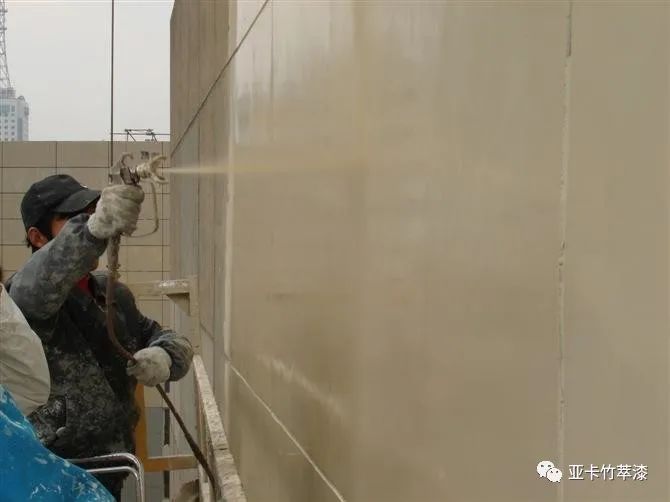 (2)根據(jù)噴涂施工要求,亞卡仿石漆可用清水調(diào)節(jié)粘度,應(yīng)從少到多試加,一定不能多加,這步最好由有經(jīng)驗(yàn)的人負(fù)責(zé)。