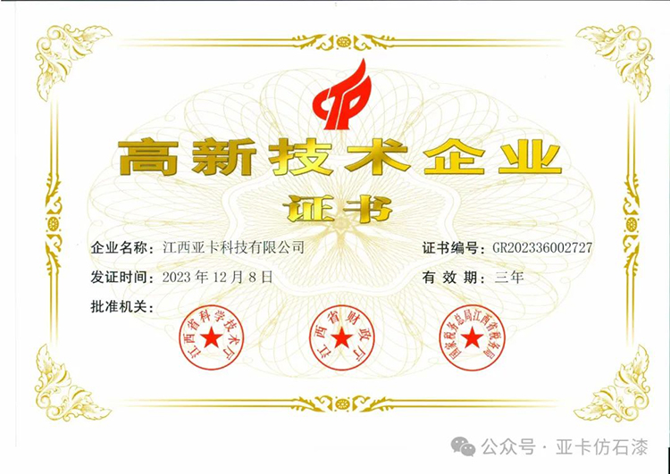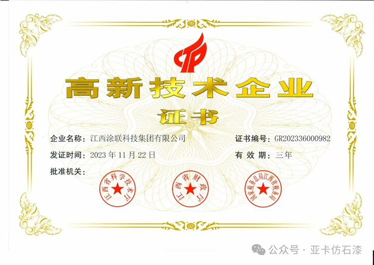 科學是發(fā)展的重要內在推動力,涂聯(lián)集團攜手旗下自主品牌亞卡涂料自成立以來,大力優(yōu)化調整產(chǎn)業(yè)結構,走自主創(chuàng)新、持續(xù)創(chuàng)新的發(fā)展道路,提高科技創(chuàng)新能力,最終喜獲國家“高新技術企業(yè)證書”。