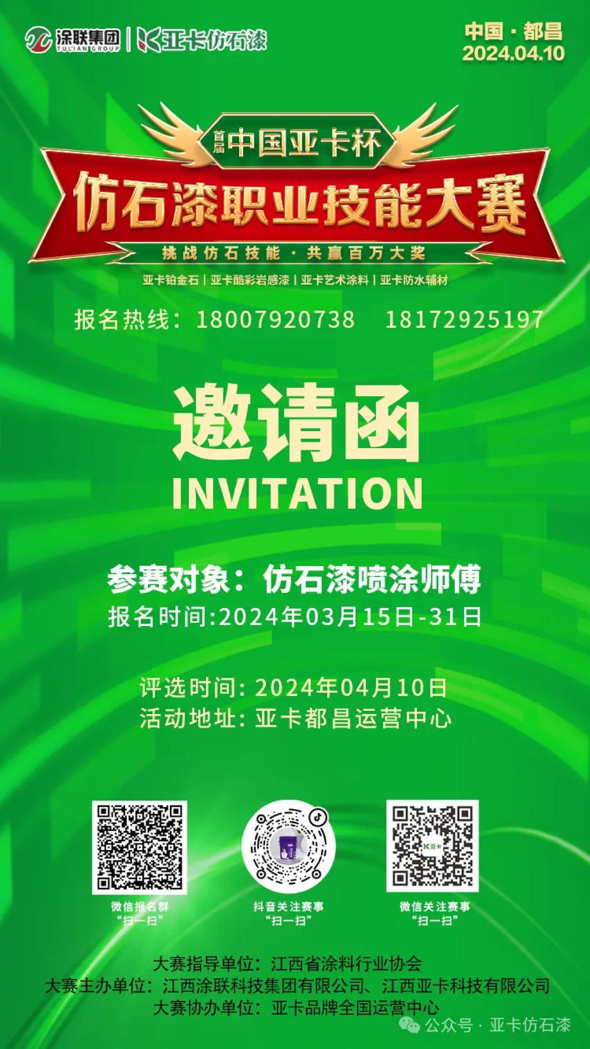 本次大賽由江西省涂料行業(yè)協指導,江西涂聯科技集團有限公司、江西亞卡科技有限公司主辦,亞卡全國各運營中心協辦。具有5年以上外墻涂裝經驗、身體健康的職業(yè)涂裝師傅均可向亞卡各地運營中心提交報名申請。